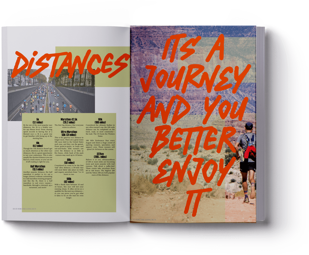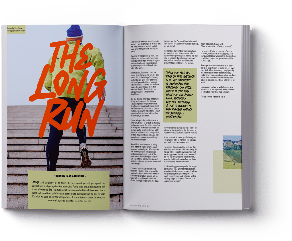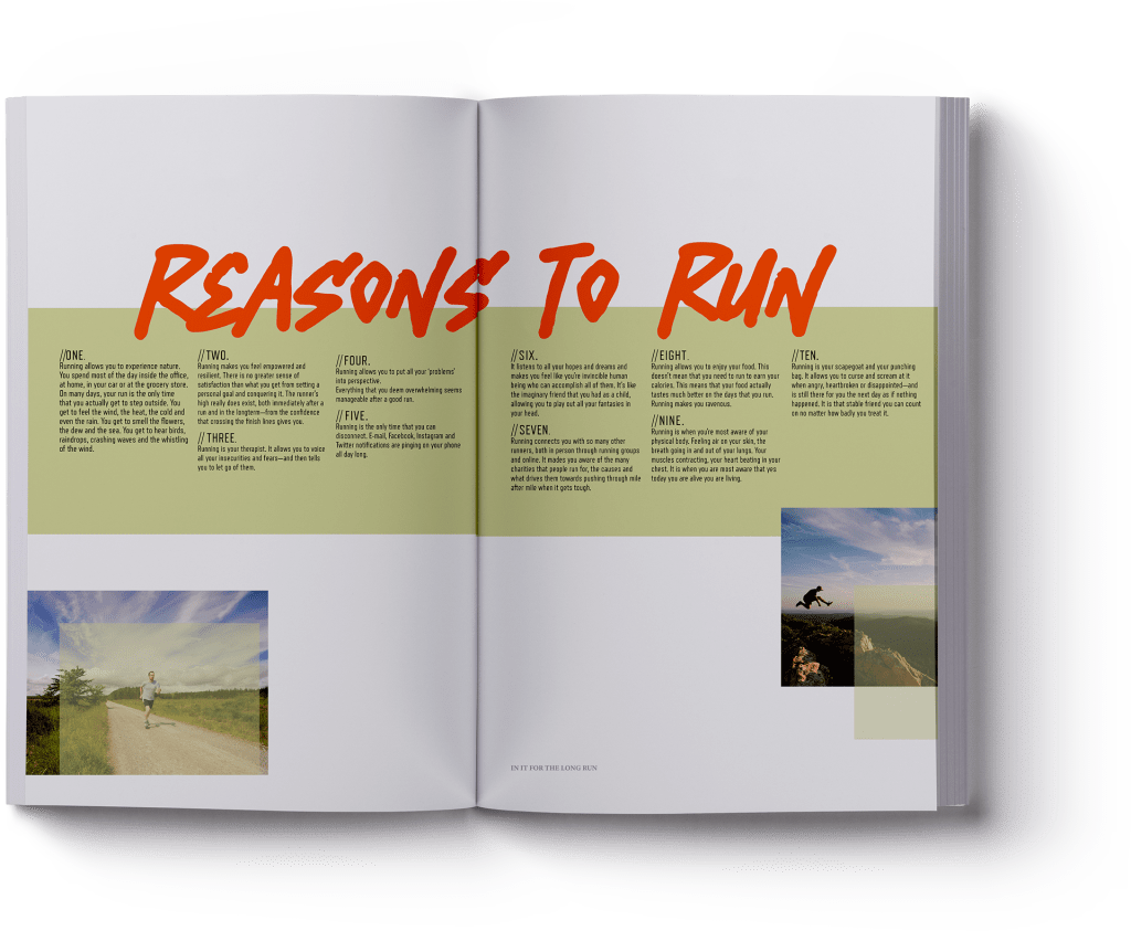 The Answer: The still before the thrill – Anticipation. Eagerness. Excitement. The bad sleep and the good times It’s always a cold dawn to start the adventure off. ‘Dawn’ magazine is born with a simple and relatable insight “ever epic adventure always starts early – a cold dawn”. With the brief cracked the execution needed to incapsulate the range of sports and nature. Using natural textures, illustration scribbled logos and deep etched action shots the cover was created. Furthering this with an article about runners and the endurance they go though.