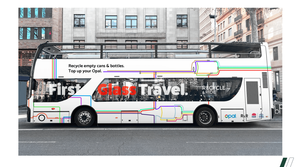 The Answer: Enter the Recycle and Ride initiative. Partnering with the Public transport industry – Bottles can now be used to top up trainsport cards (ie Opal, touchcard etc). This initial required branding and rollout with a simple distilled message leading towards recyclable bottles and cans illustrated with transport maps.