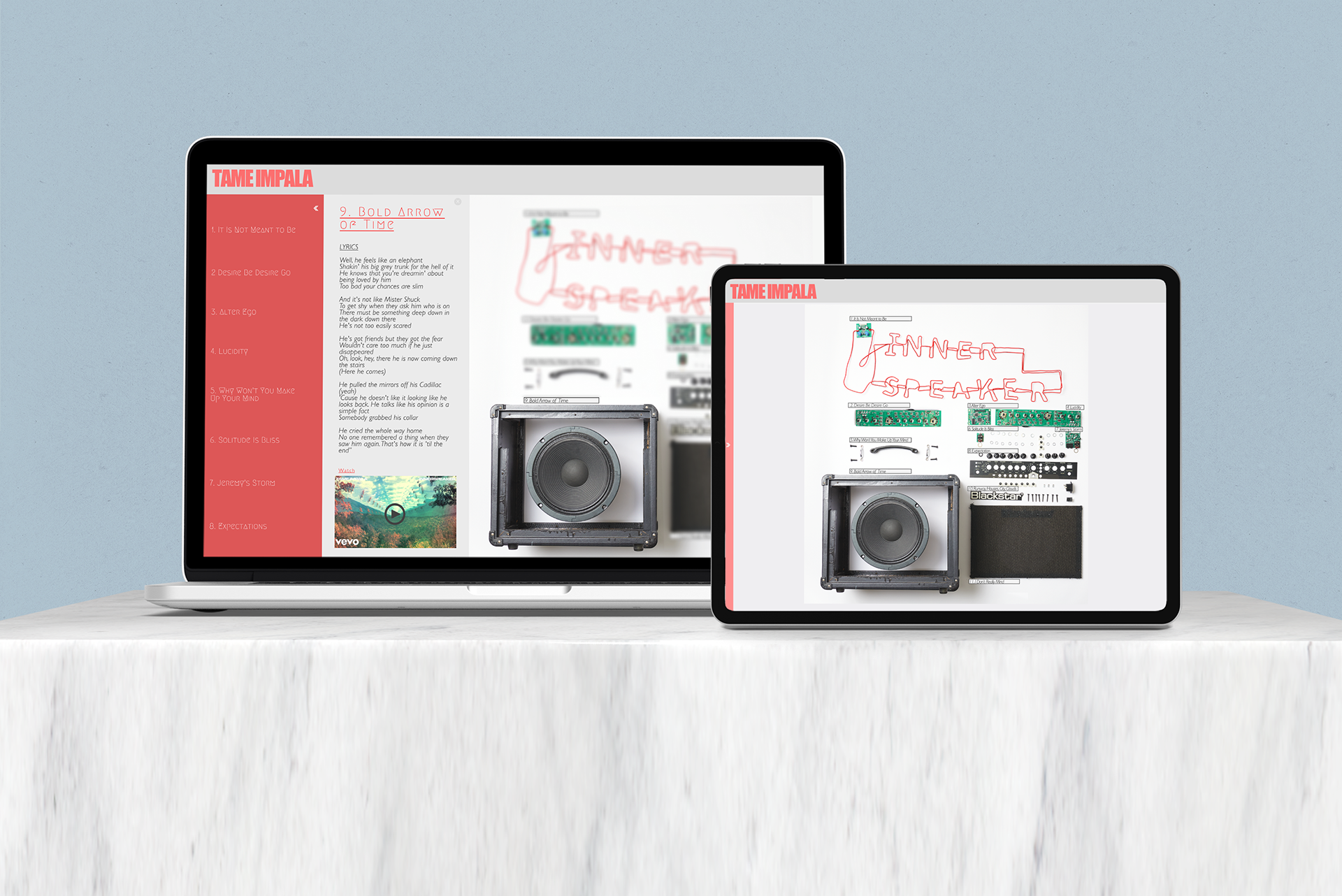 The Answer: Tame Impala is the psychedelic music project of Australian multi-instrumentalist Kevin Parker and the Album “Innerspeaker” is one of the best to hit Australian radiowaves. Taking users literally into the speaker this handmade album art work was created using flat-lay photography and a guitar amplifier. A microsite was then built out with hover states of parts that represent each song on the album.
